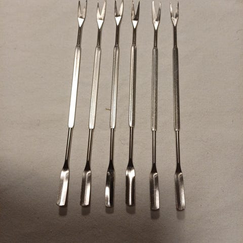 Seks krabbegafler i rustfritt stål selges rimelig. Ca. 19,5 cm lange. Pent brukte.