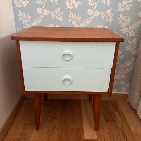 Nattbordet har to skuffer med messing håndtak. Det er helt og fint men har noen normale bruksmerker med tanke på alder. Skuffene glir lett.