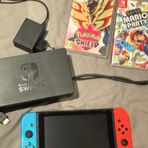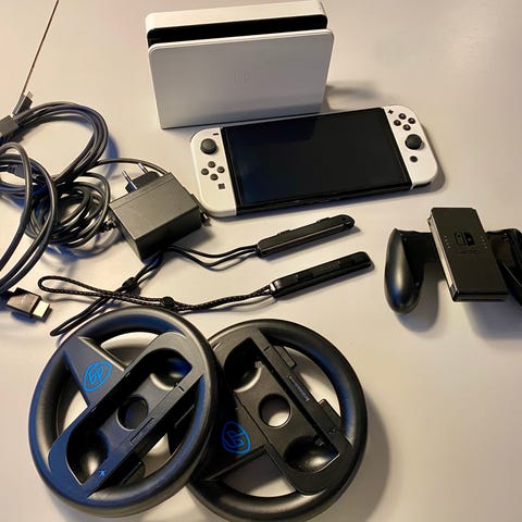 Nintendo switch oled med div. ekstra utstyr selges (alt på bilde) . Skjermen har beskyttelse glass på, og skjermen under er strøken. Det er ingen drifting i joy cons og pro controller. Det er desverre en mindre skade i det ene hjørnet i bunnen av nintendoen, men alt fungerer som det skal.