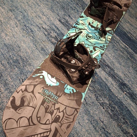 Ble kjøpt i samme tilstand for 1000 kr før jul. Bindingene passer sko opp til 34-35. Det er et lett og veldig fint nybegynner brett for småfolk.