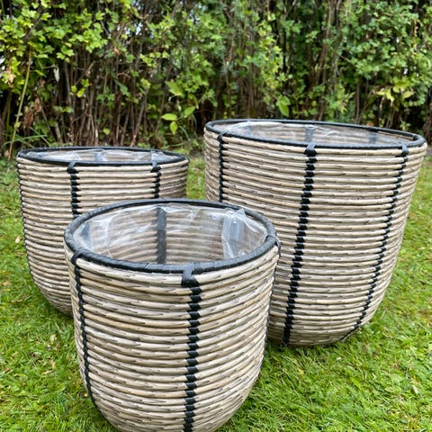 Mange forskjellige Potter og potteskjulere.ulike størrelser og fasonger, noen vegghengte, noen med skål.