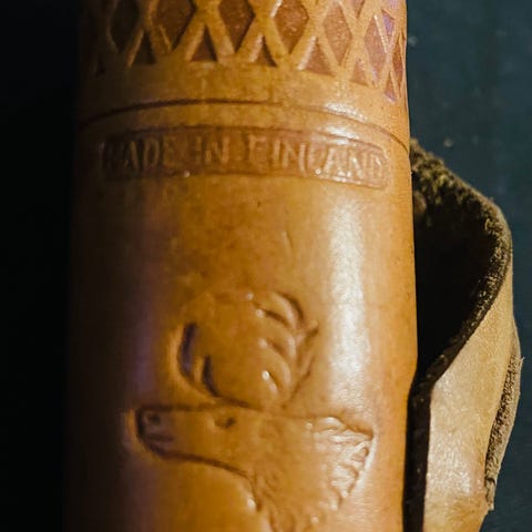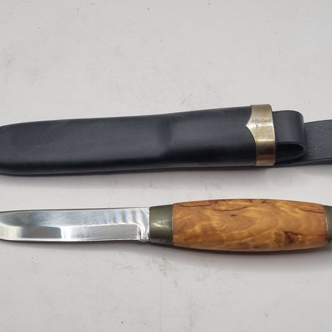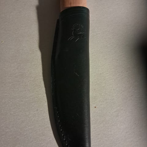 Fra samling selges ubrukt Brusletto Speiderkniven, varenr. 12301. Blad av rustfritt stål, lengde 8,7 cm. Grep av bjerk. Brun lærslire.