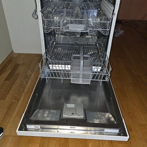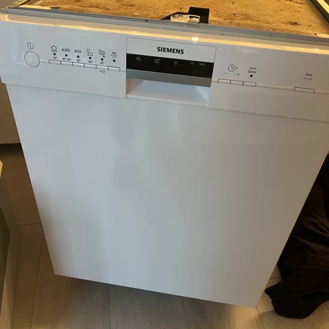 Siemens underbygd oppvaskmaskin. Produktet er designet for integrering under kjøkkenbenk, med hvit front. Ukjent alder, fulgte med huset.