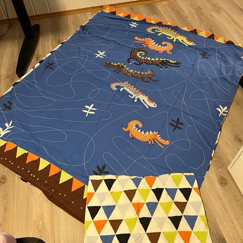 IKEA barnesengetøysett laget av bomull med fargerikt mønster. Passer til barneseng. Inkluderer putevar og dynetrekk.