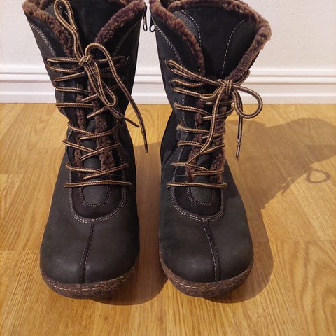 Vaffel-stretch bakpå støvletten, gjør at den smyger seg behagelig rundt leggen. Meget elegant og feminin hælhøyde, likevel stødig og god på foten. Dessverre for meg, så er de litt små på størrelsen. Dette er str. 40, men passer best 39/39,5. Jeg har akkurat maken Rieker støvletter i str. 40 uten hæl, og jeg elsker dem! 😍