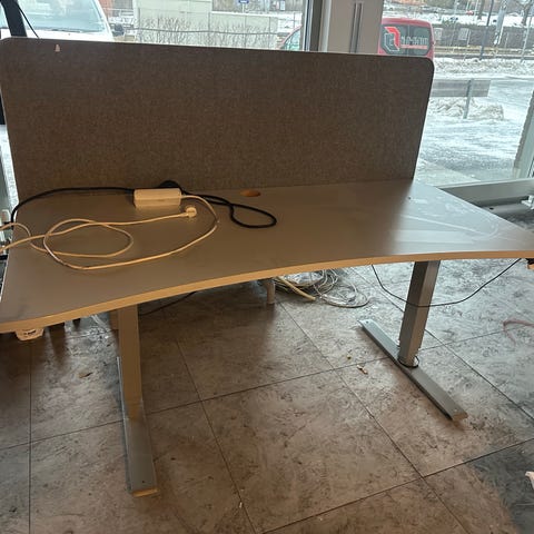 IKEA skrivebord med blå overflate. Passer til bruk som arbeids- eller datamaskinbord. Overflaten har noen riper og merker, som vist på bildene. Derfor lav pris.