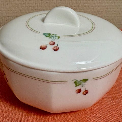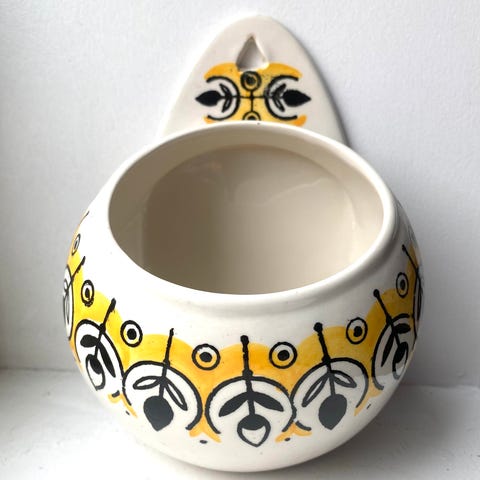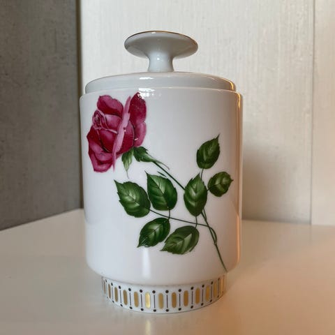 Vintage keramikkrukke med lokk, signert av Anita Nylund for JIE Gantofta i Sverige. Den er en del av serien kalt "Vår lilla stad" (Vår lille by).