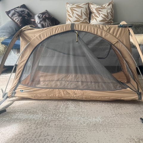 Pent brukt reiseseng. Med madrass, denne pakkes rundt selve sengen. Enkel og grei seng, med bærehåndtak.