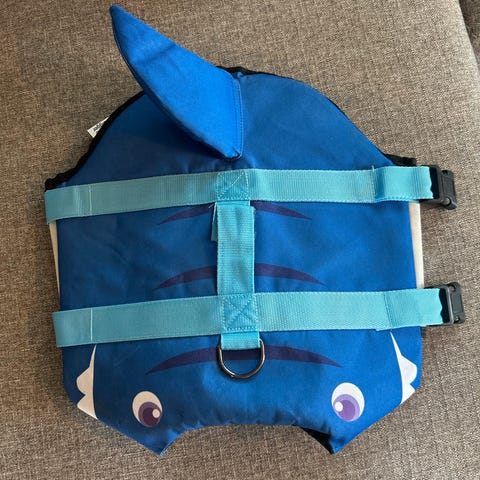 Ubrukt flytedrakt/ redningsvest for hund i størrelse XL med justerbare stropper. Designet i oransje og grå farger med refleks detaljer og en morsom hai-formet finne. Laget for å gi oppdrift og økt synlighet ved vannaktiviteter.