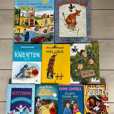 Barnebokpakke med 9 stk bøker. Noen er nesten ikke åpnet, andre er mer brukte.