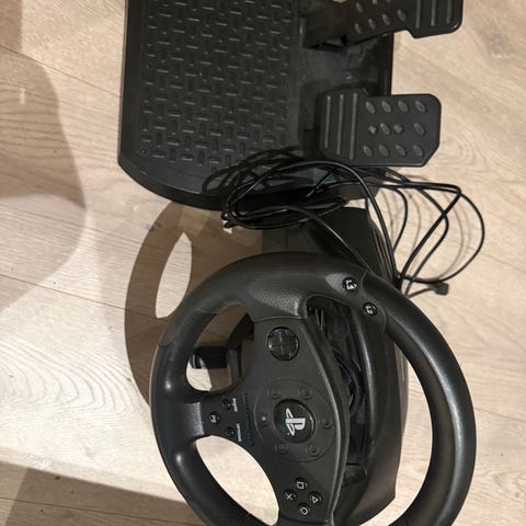 PlayStation ratt med tilhørende pedaler. Tilkoblingskabler følger med.