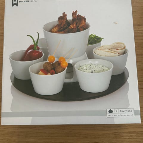 Helt ubrukt tapas - og tacosett fra Modern House. Hvite skåler og sort plate til å ha skålene på. Kun åpnet for å ta bilde.