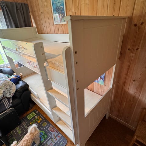 Pent brukt køyeseng. Vi måtte justere den i lengden for å få passe den inn på soverommet. Senga er 178 cm i lengden. Nederste senga er 120 cm i bredden, øverste 75 cm. Madrassene følger med. Madrasslengden er 170 cm. Senga er delvis demontert.