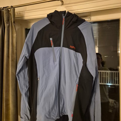 Laget av nylon og polyester. Jakken er godt egnet for utendørs bruk og har en kombinasjon av blå og svart farge.
