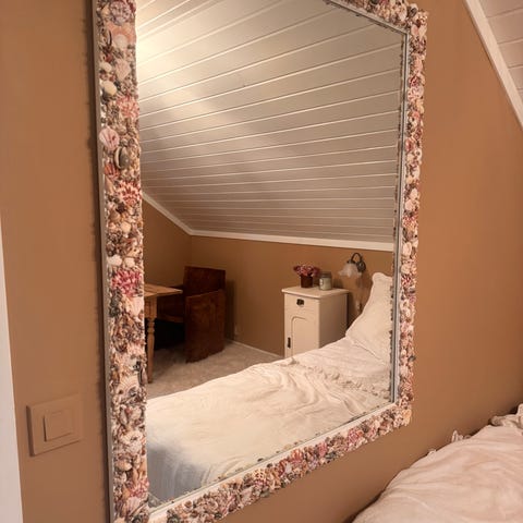 Selger et nydelig, ovalt vintage speil med en rikt dekorert gullfarget ramme. Speilet har klassiske detaljer som skjellmotiv, blomsterornamenter og elegant scrollwork – perfekt for deg som ønsker å tilføre et snev av historisk sjarm og luksus til interiøret.