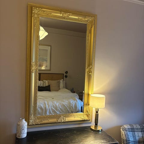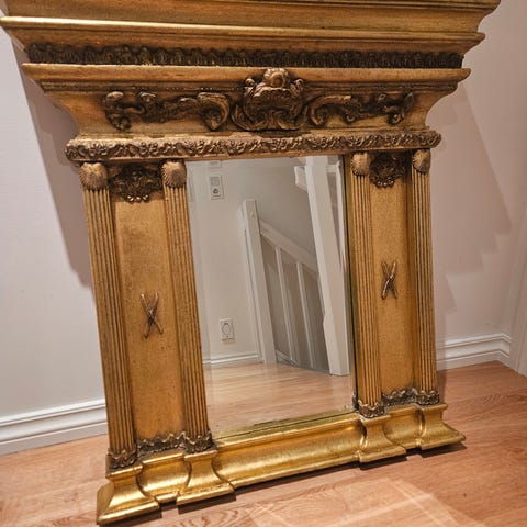 🔸 Stil: Antikk / klassisk 🔸 Farge: Gull 🔸 Materiale: Solid ramme med speilglass av høy kvalitet 🔸 Tilstand: Svært god – ingen skader eller riper 🔸 Størrelse: Ca. 40x75cm