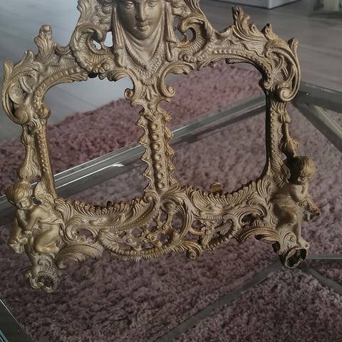 🔸 Stil: Vintage / klassisk 🔸 Farge: Gull og svart🔸 Materiale: Solid konstruksjon med detaljerte utskjæringer 🔸 Tilstand: Svært god – ingen skader 🔸 Størrelse: Ca. 85x105cm