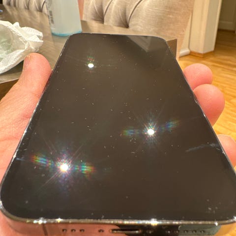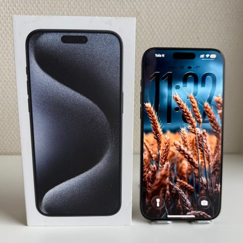 Telefonen er titanfarget og tilbehør som splitter ny, ubrukt USB-C lader og som nevnt, magnetisk ladbar deksel medfølger inkludert telefonesken. (Verdi ca 1000kr).