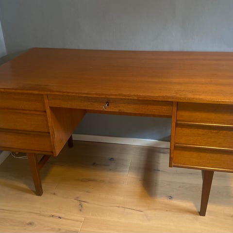 Utført med skuffer på begge sider samt midtskuff, slik modellen opprinnelig ble levert. Normal bruksslitasje og pen patina i tråd med alder.