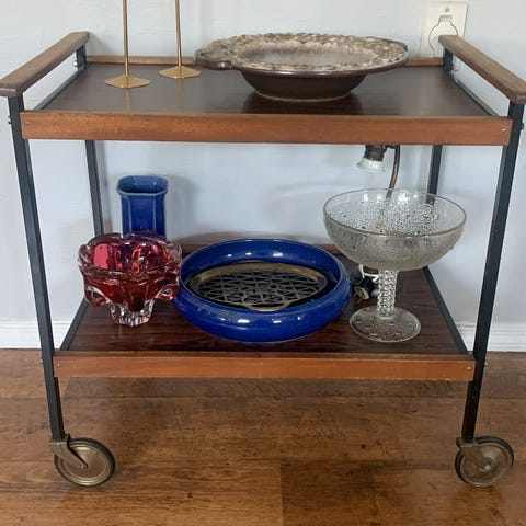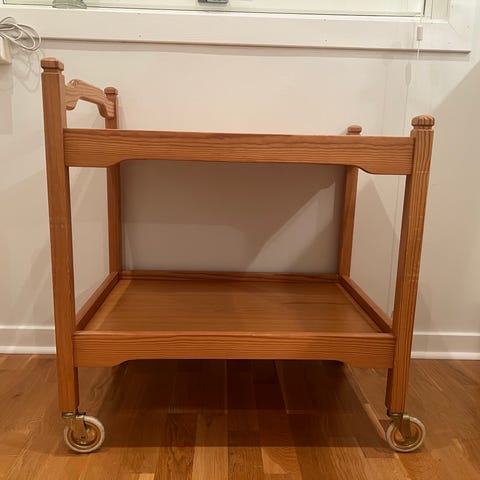 Eldre retro trillebord med glassplate søker nytt hjem. Mørkbeiset.