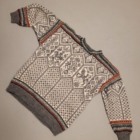 Den nydelige ol-genseren fra 1994. Hjemmestrikket i nydelige farger. Genseren er tilsvarende en Strl L.