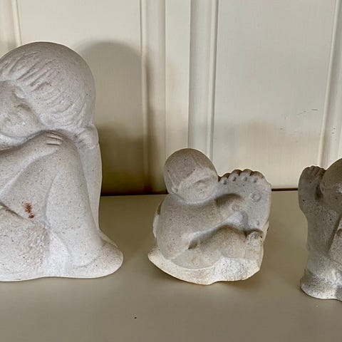 Marbell By Stone Art Belgium, stein figur selges. Et barn som skyver en barnevogn, høyde ca 14 cm. Har flere figurer. Kan sendes mot at kjøper betaler porto.