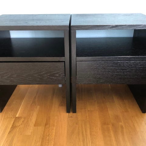 Pent og moderne vegghengt nattbord fra Skeidar, modell Wall. 2 stk selges samlet. Tar liten plass og gir et luftig uttrykk på soverommet. Praktisk med skjult oppbevaring og ekstra hylle på toppen. Kan hentes på Nesbru i Asker og muligens levere kostnadsfritt i Oslo og Bærum.