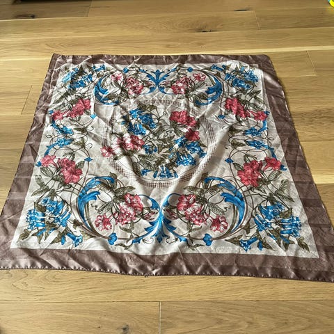 Flott mykt sjal lengde 1.90 (uten frynser) og bredde ca 70 cm. Har arvet det, så har lite info, men dette sier Google Lens: