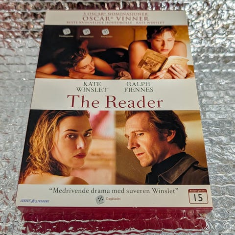 DVD-utgave av filmen The Reader med Kate Winslet og Ralph Fiennes. Filmen har aldersgrense 15 år. Norsk tekst.