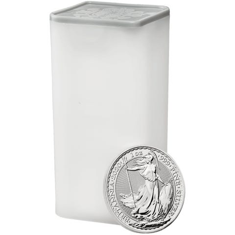 Prisen gjelder én monsterboks Britannia 1 troy oz sølvmynter fra The Royal Mint (UK).