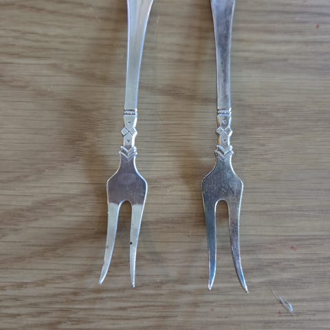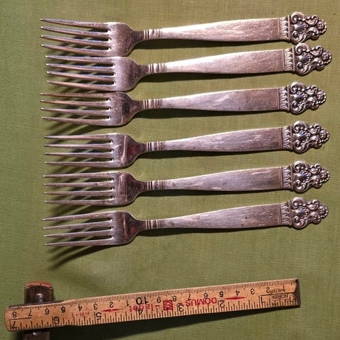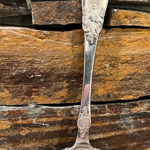 9 teskjeer, små variasjoner i lengde. 3 stk har svakt inngravert R