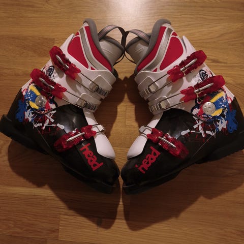 Rossignol skistøvler med lengde 26,5 hvit farge og røde spenner. Støvlene er utstyrt med fire spenner for justering og støtte. Passer for bruk i alpint. Godt brukt.