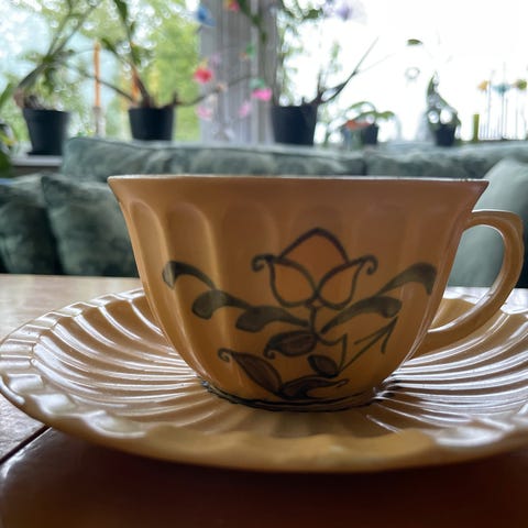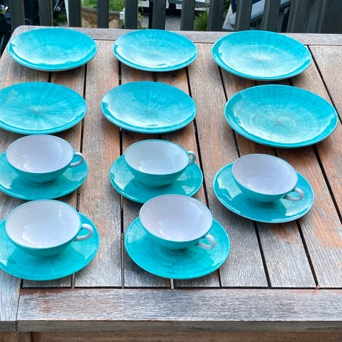 Solberg keramikk/ flintgods med fiskemotiv. Settet inkluderer 10 firkantede tallerkener, en liten skål, og en større bolle.