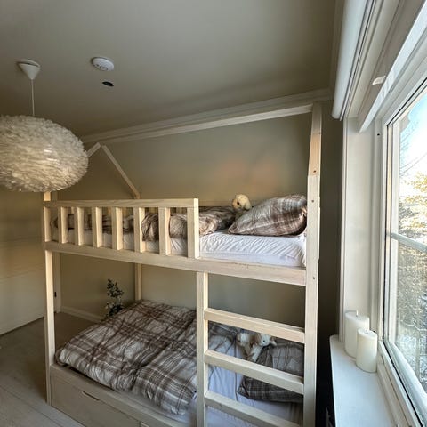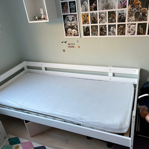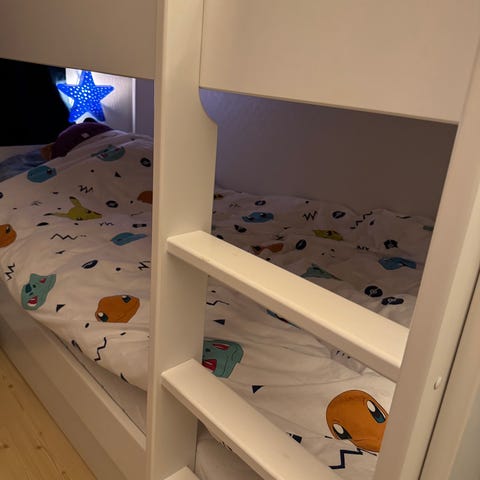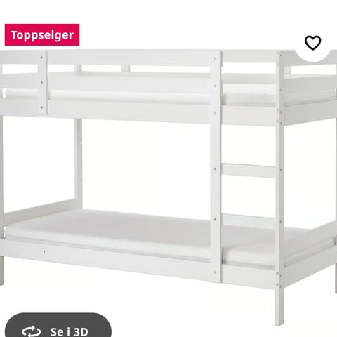 IKEA køyeseng i hvit. Denne rimelige køyesenga er laget av massivt tre – et slitesterkt materiale som varer i generasjoner, og som kan gjenvinnes når barna flytter hjemmefra.