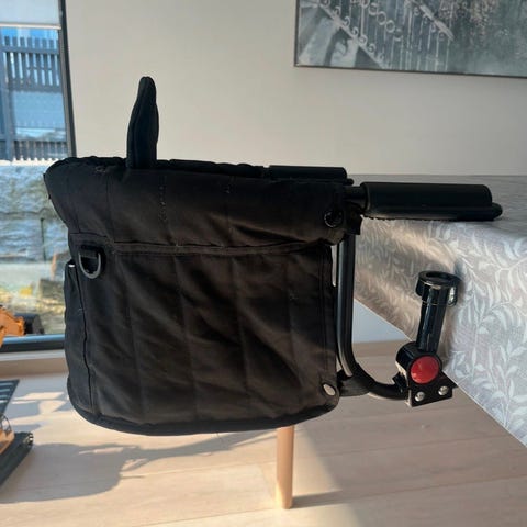 Carena reisestol i svart til barn. Sammenleggbar ramme så den blir helt flat og praktisk å reise med. Festes på bord. Pent brukt.
