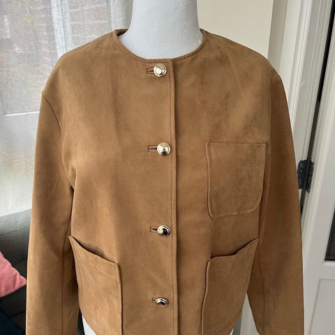 H&M Andre jakker i størrelse L for dame. Jakken har beige farge og er laget av fuskepels. Den har to lommer foran og knappelukking.