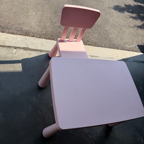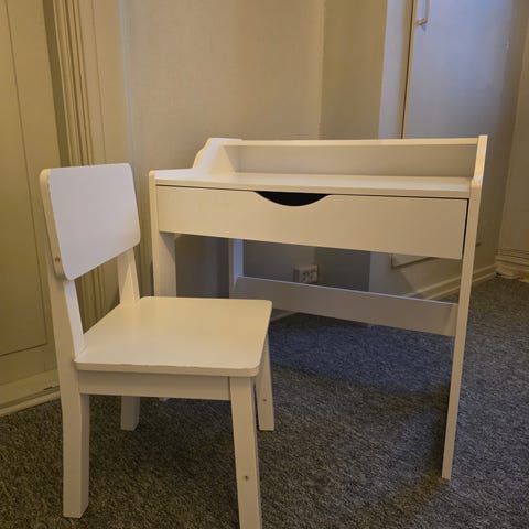 Jollyroom barneskrivebord med tilhørende stol i rosa farge. Møblene er laget for barn og har en praktisk skuff for oppbevaring. Passer for bruk i barnerommet som et skrive- eller lekebord.