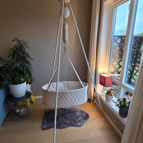 Farge nature og stativet er i fargen cream white. Vi sleit me at lille skulle ligge for seg selg og ville bare sove oppå meg, etter at vi begynnte og bruke moonboon lærte hun seg og sove forseg selv, den har vært super genial og vi har elska den! Den har gjort de føsteukene til en drøm! Den er vasket og klar for ny eier!