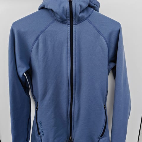 Houdini genser i størrelse S for kvinner, laget av resirkulerbart polyester. Genseren har en lysblå farge og er egnet som et plagg for hverdagsbruk eller lag-på-lag ved kjøligere vær.