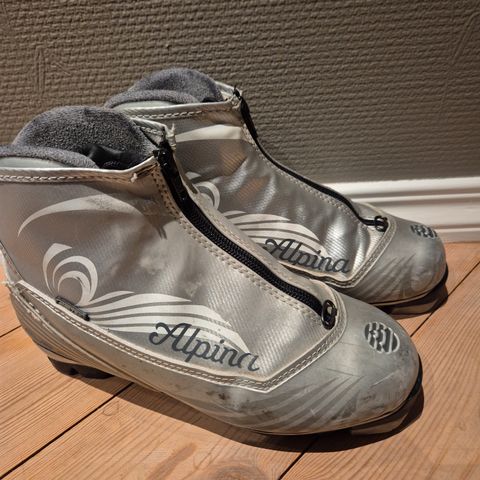 Hvite Alpina Eve 30s skisko. Skiskoene har glidelås foran, knyting og stropp foran ankelen. Usikker på om de er kombi eller klassiske skisko, men har gått mest klassisk med dem. De er godt brukt, men det er fremdeles mye liv i dem igjen. Det står str40 i dem, men jeg har størrelse 38 og de har passet meg bra. Kan sendes eller hentes på Ammerud.