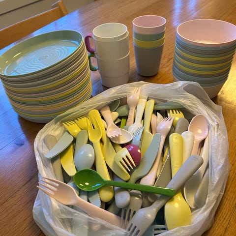 Selger et sett med barneservise fra Ikea.