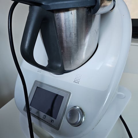Thermomix TM6 kjøkkenmaskin med digital skjerm og flere tilbehør inkludert ekstra bolle, lokk og måleutstyr. Maskinen har rustfri stålbolle og er egnet for matlaging og oppskrifter som krever presis kontroll og funksjonalitet.