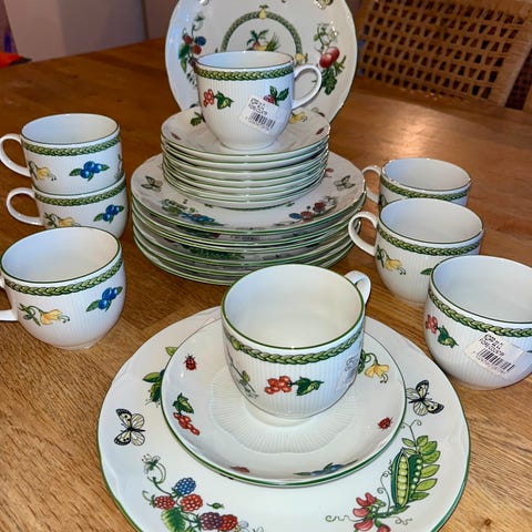Serviset har ingen skader og består av 4 kopper, 6 tefat og 6 asjetter