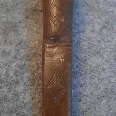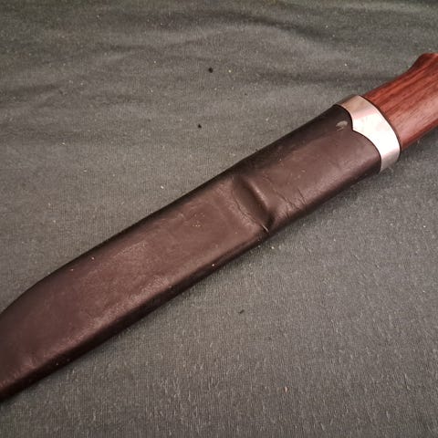Ubrukt strøken kniv med utrolig skarp egg, gått skaft og solid lærslire.Frakt 70.- tilkommer.