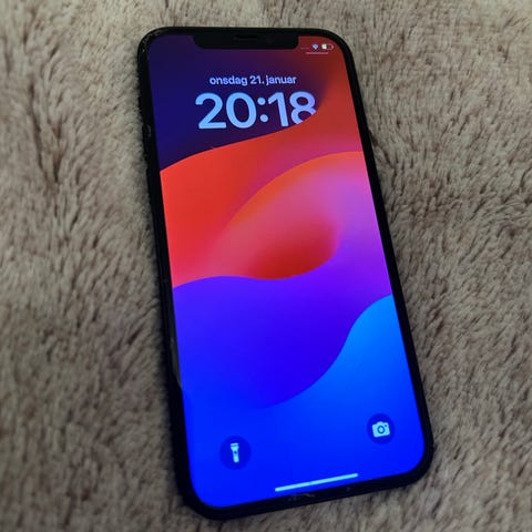 Apple iPhone 12 mobiltelefon med 64 GB lagringskapasitet. Enhet med glass- og metallkonstruksjon. Telefonen selges med kvittering og originalemballasje. Tlf har blitt benyttet med beskyttelse av glass og deksel på baksiden. Tlf har ikke byttet display eller andre komponenter.