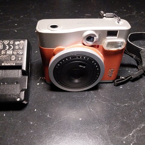 Fujifilm Instax Mini Evo instantkamera med kombinasjon av digital og analog funksjon. Kameraet har en kompakt størrelse og er designet med svart og sølv farge. Egnet for øyeblikkelig fotografering med mulighet for utskrift av bilder i mini-format.