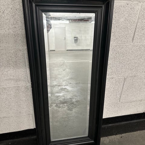Flott IKEA speil med svart ramme. Speilet har et moderne design med en bred svart ramme, egnet for bruk i ulike rom som gang, stue eller soverom. Eller ved styling av bolig for salg.