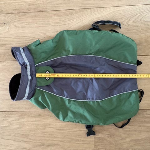 Ytterstoffet er vannavvisende og innsiden er myk og varm. Dekkenet har god passform og gir hunden fri bevegelse. Til tross for noen bruksmerker er det kun brukt på noen få turer da det er fort stort for staffen vår.