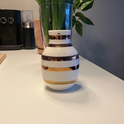Kähler vase med dekorative sølvstriper. Vasen har et rundt design med horisontale striper i sølvfarge på hvit bakgrunn. Egnet som dekorasjon i hjemmet.