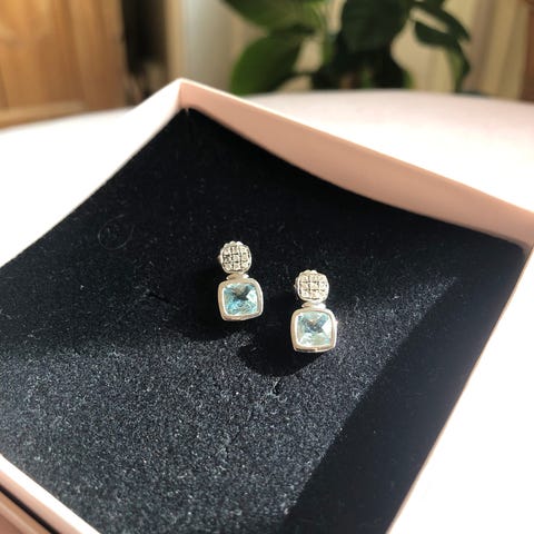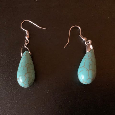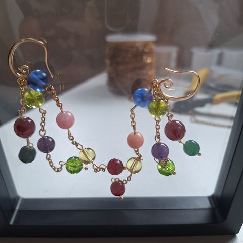 Dame Øredobber laget med halvedelstener og gullbelagt materiale. Øredobbene har en diameter på ca. 12 mm og veier ca. 3,7 gram.